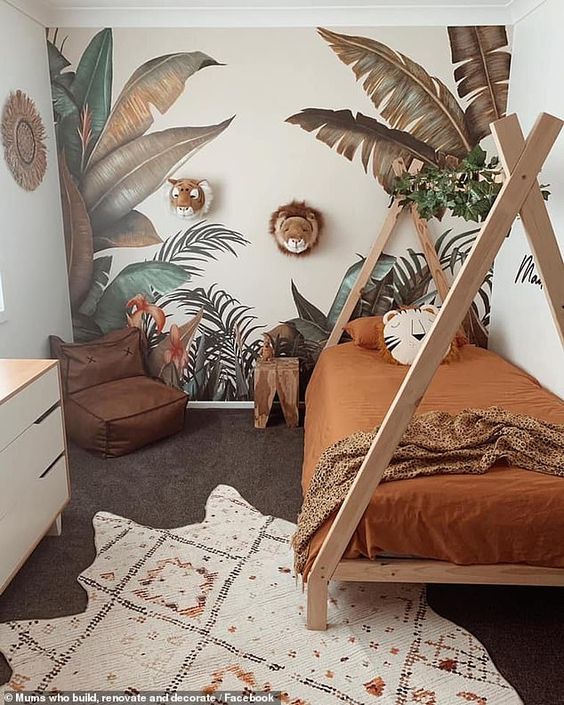 Memiliki ranjang yang unik serta banyaknya dekorasi yang mengusung tema tumbuh-tumbuhan menjadikan kamar ini bisa menjadi salah satu inspirasi desain untuk anda yang memiliki anak yang suka berpetualang di alam. Adanya tambahan aksen warna coklat menjadikan kesan kamar ini nampak makin enak dipandang.