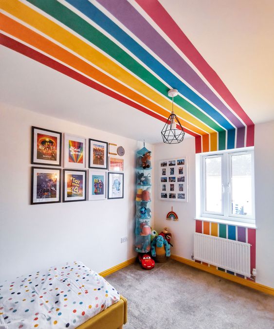 Kamar yang luas ini mengedepankan konsep minimalis, rapi dan juga terstruktur terlihat dari dekorasi-dekorasi yang di pajang tertata rapi. Mengusung tema Pelangi, penempatan dekorasi pelangi yang besar serta menjangkau hampir seluruh kamar menjadikan konsep desain ini menarik untuk ditiru.