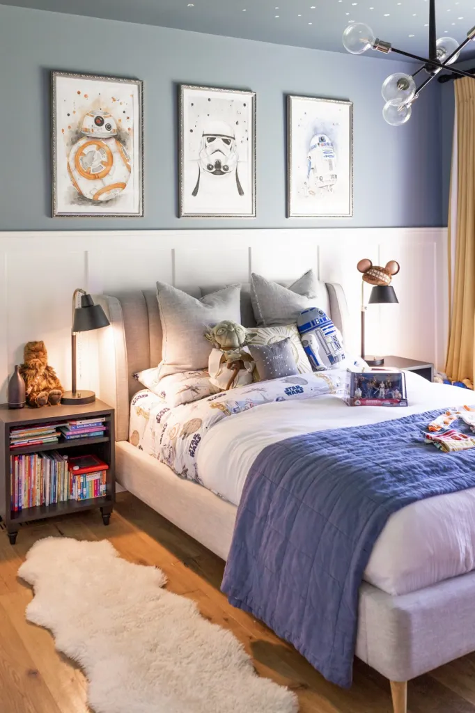 Desain kamar tidur bertema Star Wars ini terlihat cukup menarik dan juga elegan dimana perpaduan warna putih dan warna abu-abu gelap menjadikannya terlihat menarik. Beberapa pernak-pernik Starwars pun ditambahkan seperti poster dinding Star Wars dan juga beberapa boneka yang menghiasi lemari kecil dan tempat tidur. Tidak lupa juga atapnya dibuat memiliki desain antariksa agar sesuai dengan tema Star Wars.
