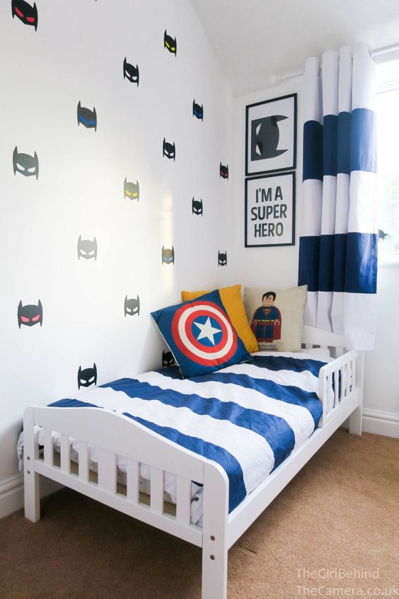 Bertemakan superhero dengan nuansa dominan putih dan biru dapat membuat tampilan kamar anak laki-laki anda ada berasa lebih elegan tapi tetap mengusung tema superhero yang mereka inginkan.