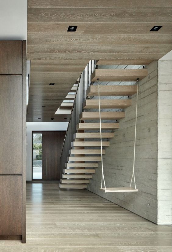 Tangga yang satu ini mengusung desain tangga modern di mana menggunakan kayu pada anak tangga nya dan menggunakan bahan besi pada bagian pegangannya. Yang menjadikan tangga itu unik adalah pada bagian bawah memiliki ayunan yang digunakan untuk anak-anak bermain atau hanya sebagai bagian dari dekorasi rumah.