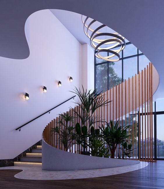 Tangga rumah yang selanjutnya ini menggunakan konsep tangga rumah yang sedikit melengkung, didominasi dengan warna putih pada bagian yang ditambah aksen coklat jadikan ini terlihat minimalis dan bagus. Pemilihan warna hitam pada bagian peganggan tanda menjadikan kombinasi warna yang menarik.