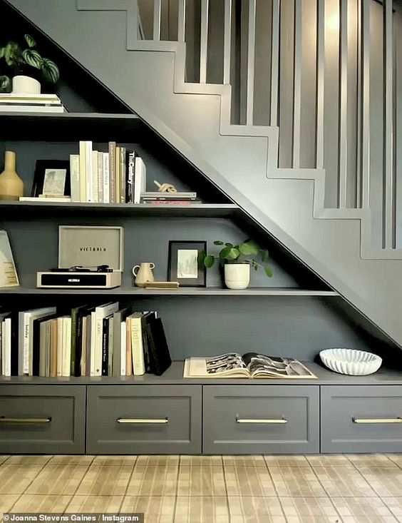Tangga yang satu ini mengusung desain tangga minimalis dan sederhana, yang membuatnya menarik adalah pada bagian bawah tangga ini digunakan untuk menaruh beberapa barang seperti buku, tanaman dan berbagai macam dekorasi yang menjadikan tangga ini cukup multifungsi.