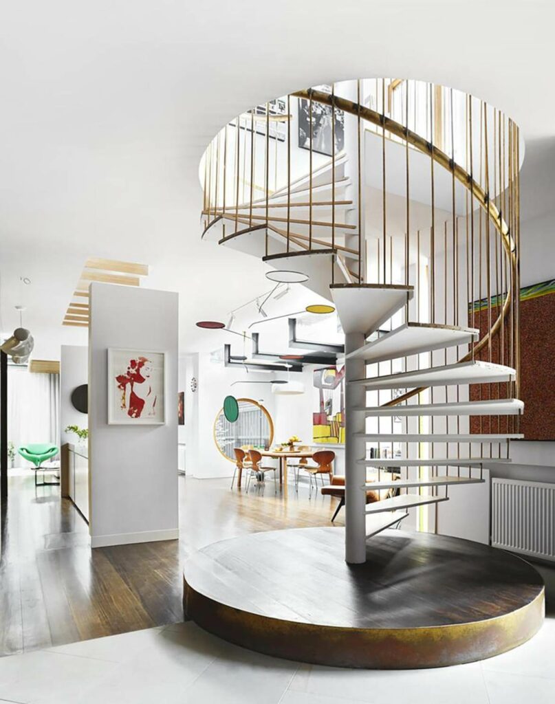 Tangga yang satu ini memiliki konsep dasar tangga spiral, dimana tangga spiral ini cocok untuk rumah yang sempit maupun yang luas. Dengan balutan warna putih dan warna kuning keemasan menjadikan tangga ini terlihat minimalis dan juga mewah.