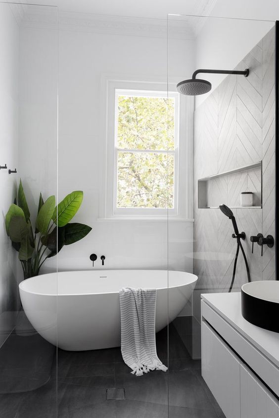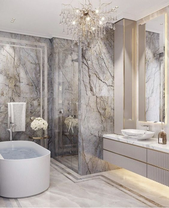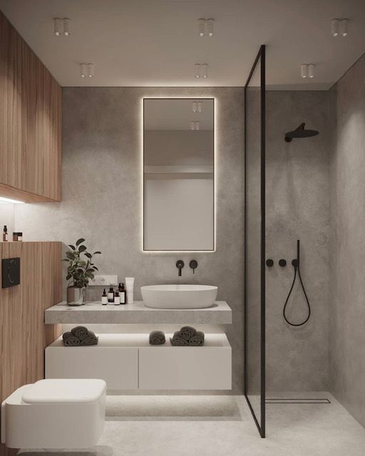 Kamar mandi mewah yang satu ini memiliki konsep minimalis dan juga elegan. Menggunakan perpaduan warna hitam dan juga abu-abu menjadikan kamar mandi ini ini terlihat modern. Pencahayaan yang bagus di sisi atas dan juga di sisi Tengah menjadikan kesan modern dan elegan semakin apa pada kamar mandi ini.