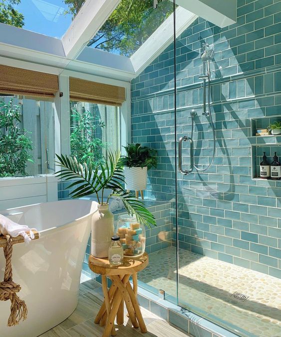 Desain kamar mandi yang satu ini mengedepankan nuansa alami yaitu dengan menggunakan beberapa interior yang terbuat dari kayu dan juga ditambah dengan tumbuh – tumbuhan. Memiliki andil yang sangat besar di atas yang dapat digunakan sebagai masuknya cahaya dari luar menjadikan kamar mandi ini terasa nyaman.