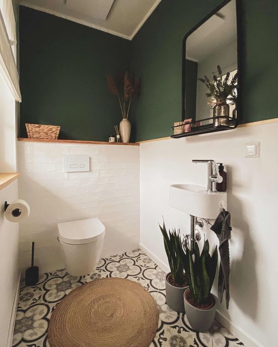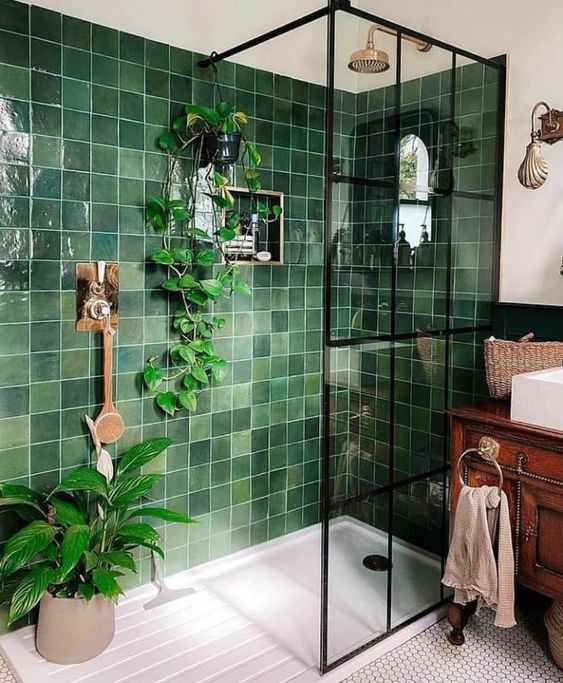 Kamar mandi yang satu ini mengusung tema desain minimalis dengan nuansa perpaduan warna hijau gelap dan juga putih. Kurma hijau di sini digunakan hanya untuk bagian atas kamar mandi, tidak hanya itu warna hijau di sini juga dihasilkan dari beberapa tumbuhan yang ada di dalam kamar mandi ini. Warna putih disini ada di bagian interior dan juga bawah dinding kamar mandi. Perpaduan warna ini menjadikan kamar mandi terlihat natural dan elegan.