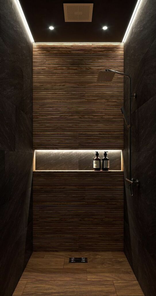 Kamar mandi yang satu ini sangat elegan ketika dipandang karena memiliki perpaduan warna hitam dan juga coklat. Hitam di sini menggunakan marmer sedangkan warna coklat menggunakan pattern kayu. Ditambah pencahayaan yang bagus membuat kamar mandi ini makin elegan.