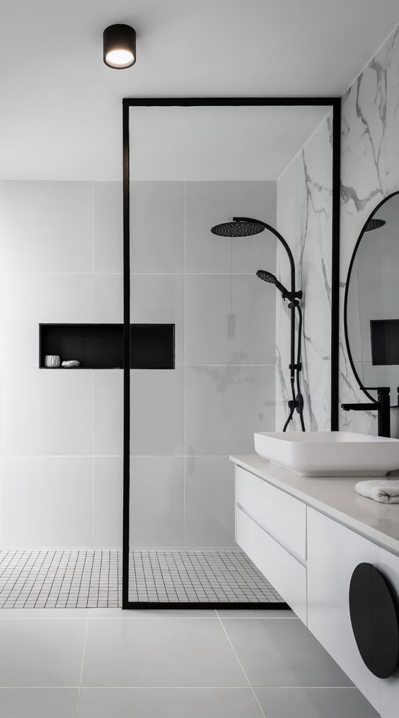Nuansa yang ditawarkan oleh kamar mandi ini adalah minimalis dengan Dominasi warna hitam dan juga putih. Warna putih terletak pada dinding interior seperti lagi dan juga atapnya. Sedangkan warna hitam terletak pada bagian frame kamar mandi, shower dan frame kacanya.