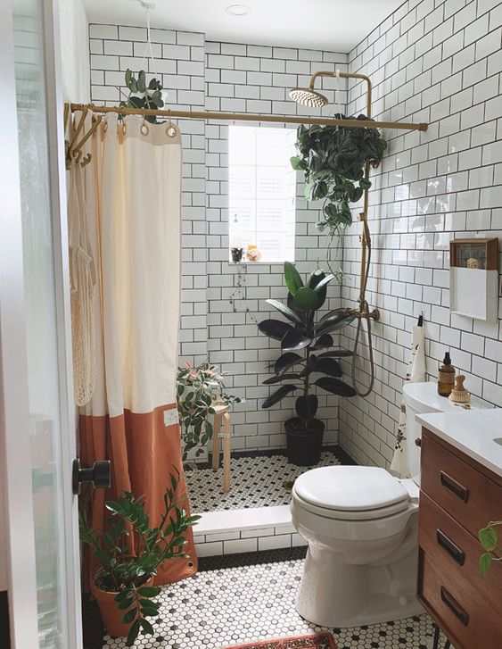 Kamar mandi yang satu ini cukup unik dana menggunakan double balok pada seluruh dindingnya, menggunakan pattern balok menghasilkan nuansa yang klasik pada kamar mandi ini. Ditambah dengan aksesoris seperti beberapa tanaman menjadikan kesan kamar mandi ini alami dan juga bersih.