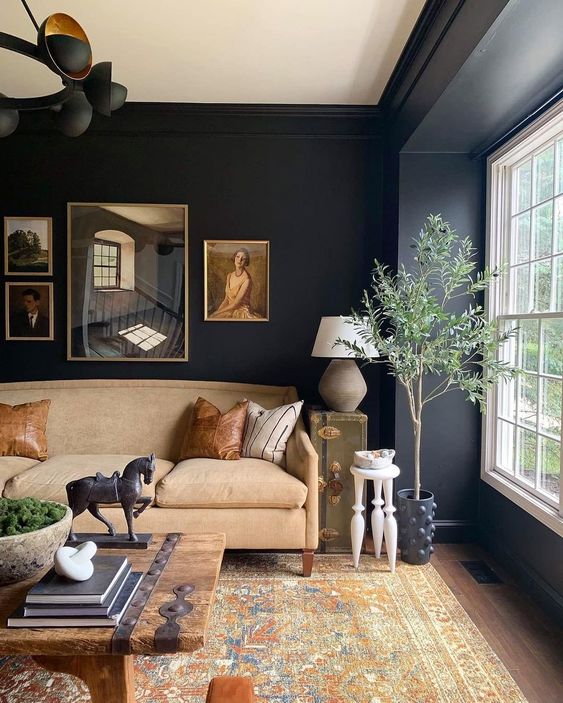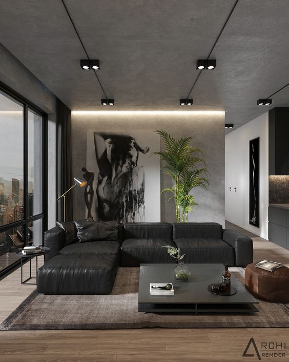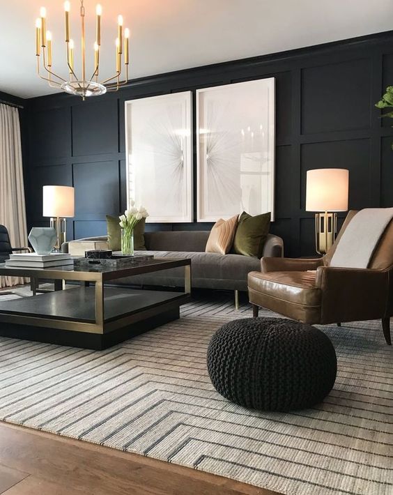 Ruang tamu yang satu ini memiliki nuansa warna hitam dan juga coklat, menjadikan ruangan ini tampak terlihat natural dan juga elegan. Warna hitam di sini terlihat dari bagian dindingnya sedangkan warna coklat terlihat dari interior dan juga lantainya.