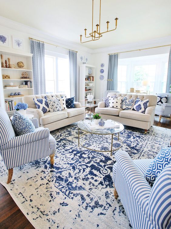 Ruang tamu yang satu ini memiliki konsep nuansa putih dan juga biru terang, menjadikan ruangan ini tampak menyenangkan dan juga nyaman ketika digunakan. Warna putih di sini tampak dominan pada bagian atap dan juga dinding, sedangkan warna biru tampak pada interiornya seperti kursi, gorden dan juga karpetnya.