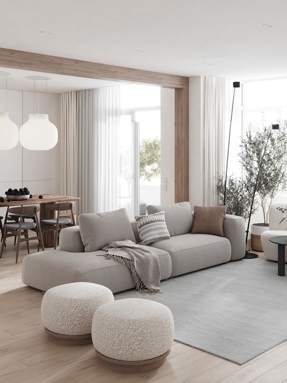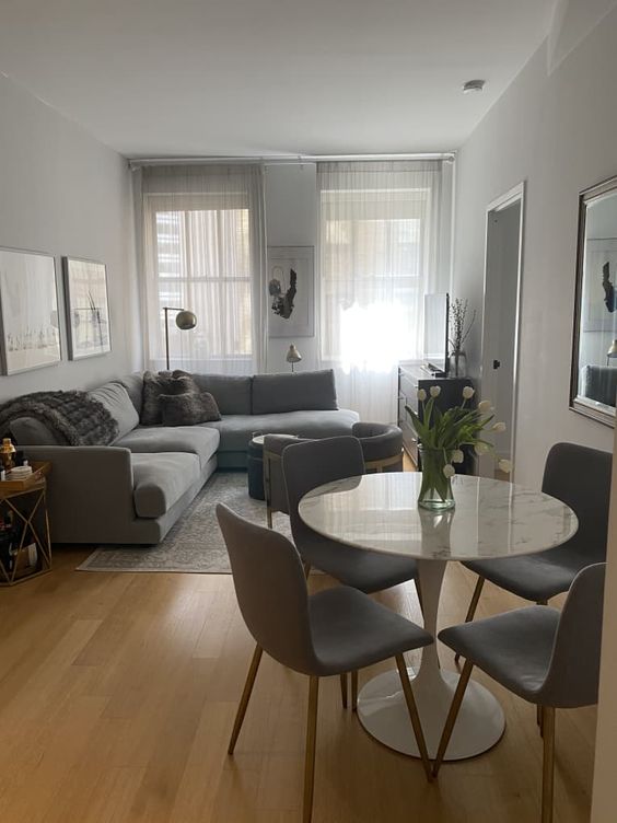 Ruang tamu yang satu ini terlihat cukup luas karena selain memiliki ruang tamu juga menjadi ruang makan. Mengusung nuansa modern dan juga minimalis dengan dominasi warna abu-abu dan juga coklat menjadikan ruang tamu ini terlihat menarik dan nyaman untuk digunakan bersantai.