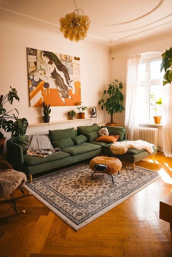 Ruang tamu yang satu ini mengusung desain nuansa putih dan juga hijau, warna putih di sini tampak terlihat pada dinding dan atapnya sedangkan warna hijau disini terlihat dari sofa dan juga beberapa tanaman yang ada pada ruangan ini yang juga memberikan kesan alami. Memiliki pencahayaan yang bagus membuat kamar ini terlihat semakin menarik.