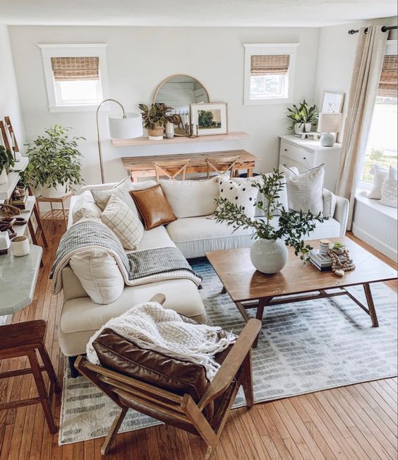 Ruang tamu yang satu ini memiliki nuansa yang cukup unik yaitu karena ditempatkannya banyak tumbuh-tumbuhan pada ruang tamu ini menjadikan ruang tamu ini terlihat sangat alami dan juga natural. Apa lagi dengan ditambah perpaduan warna putih dan juga warna coklat yang dihasilkan dari interior yang berbahan kayu menjadikan kesan alami disini makin terlihat.