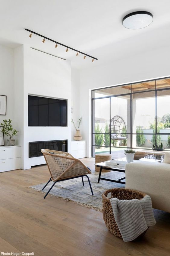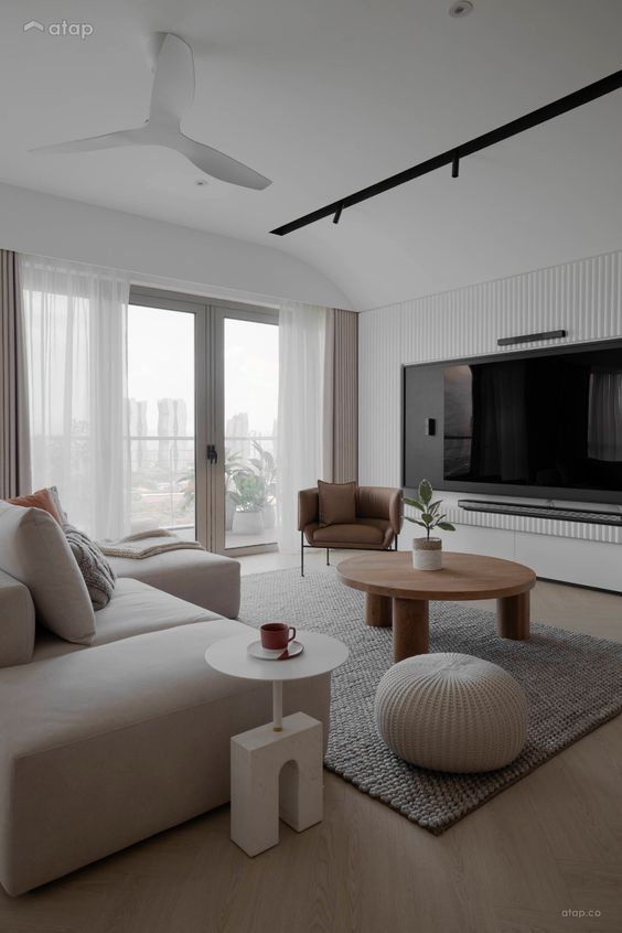 Ruangan yang satu ini mengusung konsep desain scandinavian, konsep skandinavian disini terlihat dari pencahayaannya yang bagus karena memiliki cermin yang besar dan juga interiornya yang memiliki bahan dasar terbuat dari kayu contohnya pada meja. Secara keseluruhan penataan dan juga perpaduan warna pada ruang tamu ini terlihat sangat bagus.