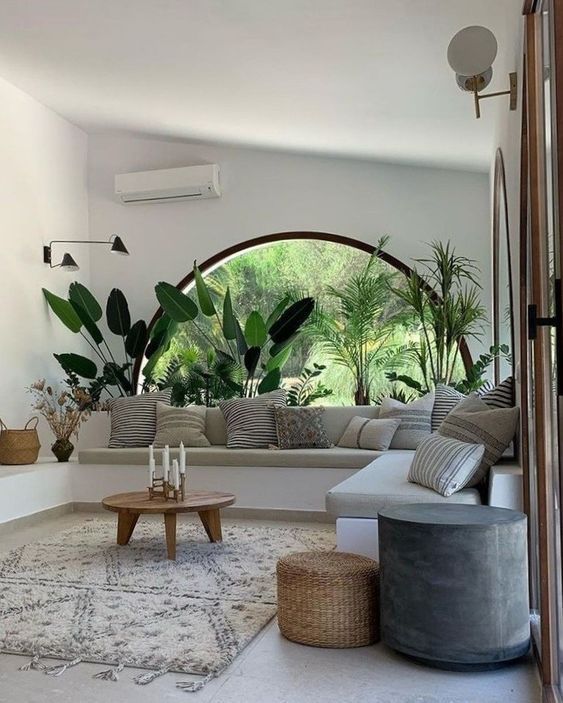Ruang tamu yang satu ini memiliki konsep yang natural, di mana Banyak sekali tanaman yang dipajang untuk menghiasi ruangan ini. Konsep Nature yang sebelumnya, konsep natural di sini lebih ke arah modern menjadikannya tampak terlihat natural dan juga elegan.