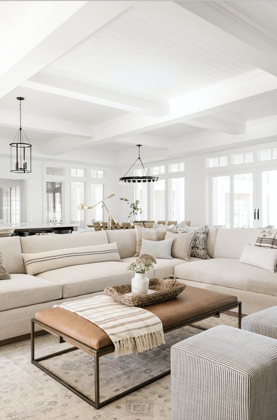 Ruang tamu yang satu ini memiliki konsep nuansa desain yang hampir pada seluruh bagiannya berwarna putih, memiliki pencahayaan yang bagus juga membuat warna putih disini terlihat makin terang. Berisi interior berwarna sedikit berbeda dengan warna putih dan dihiasi dengan meja berwarna coklat menjadikan perpaduan warna pada ruangan ini terlihat sangat menarik.