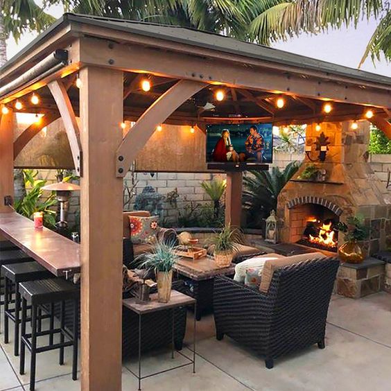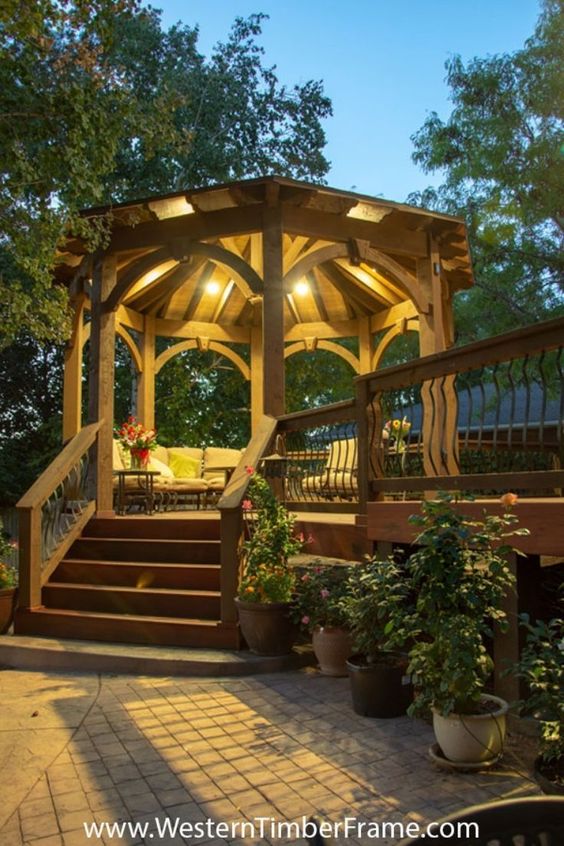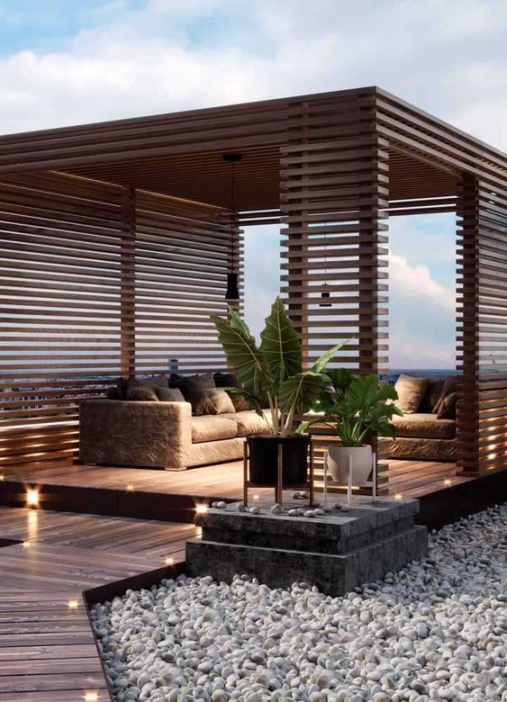 Gazebo yang satu ini ini mengusung desain konsep gazebo modern, di mana gazebo ini menggunakan bahan dasar kayu yang disusun secara rapi. Menjadikan kayu sebagai bahan utama membuat gazebo ini bernuansa natural dan juga elegan dengan adanya cahaya lampu.