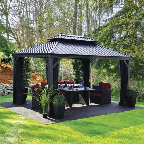 Gazebo yang satu ini menggunakan konsep desain modern dimana sudah tidak menggunakan kayu melainkan menggunakan bahan aluminium dan juga besi. Menggunakan konsep nuansa hitam menjadikan gazebo  ini tampak modern dan juga elegan.