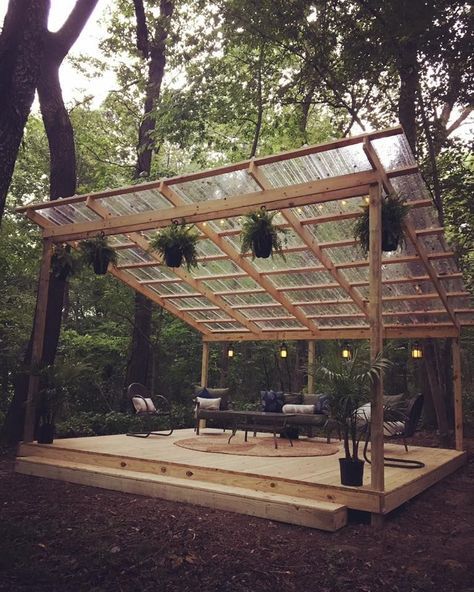 Gazebo yang satu ini terlihat cukup luas untuk ukuran gazebo, dimana pada gazebo ini memiliki beberapa kursi dan juga meja. Dibuat dengan menggunakan bahan kayu pada semua sisinya dan memiliki atap yang transparan menjadikan gazebo ini cukup unik dan gampang untuk diikuti model pembuatannya.